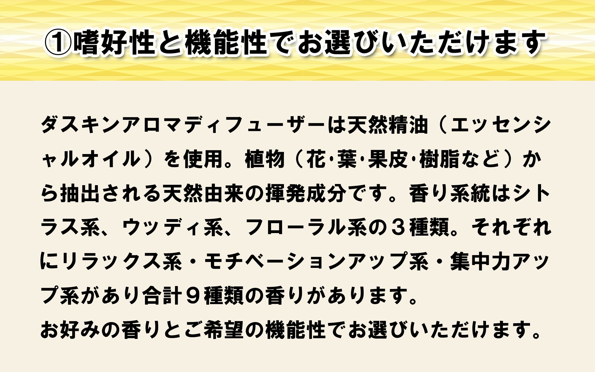 シトラス系、ウッディ系、フローラル系と3種類がありそれぞれにリラックス系、モチベーションアップ系、集中力アップ系の3種類があります。